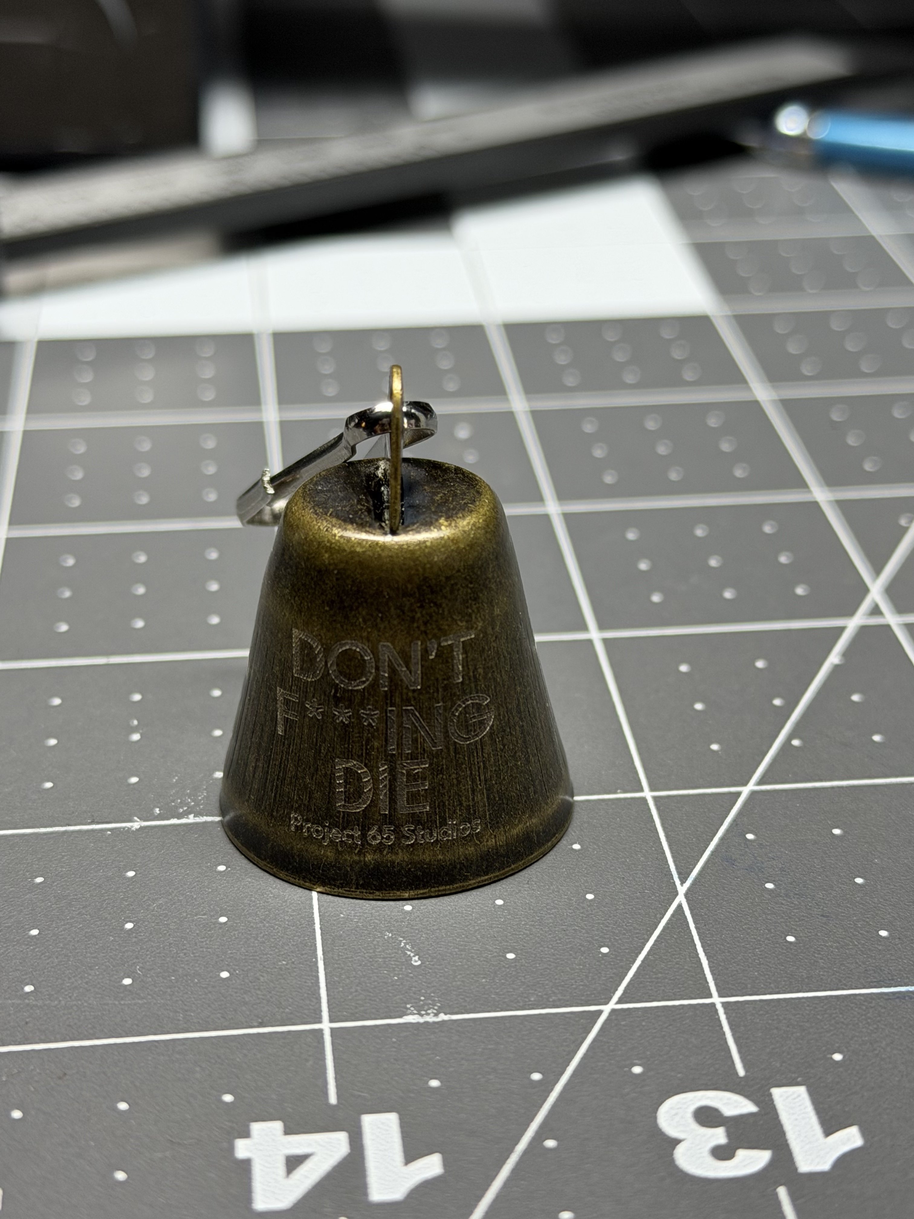 This “DON’T F**KING DIE” Bell is fiber-laser engraved in-house by Project 65 Studios on a stamped metal bell with a vintage bronze finish. It’s blunt on purpose. Whether you hang it on your bike, keys, garage wall, or workspace, it’s meant to be a quiet reminder of risk, awareness, and respect for the ride. Each bell is engraved individually. The finish shows natural variation from the engraving process and handling, so no two pieces are exactly the same. This isn’t a novelty item. It’s a piece of riding culture.